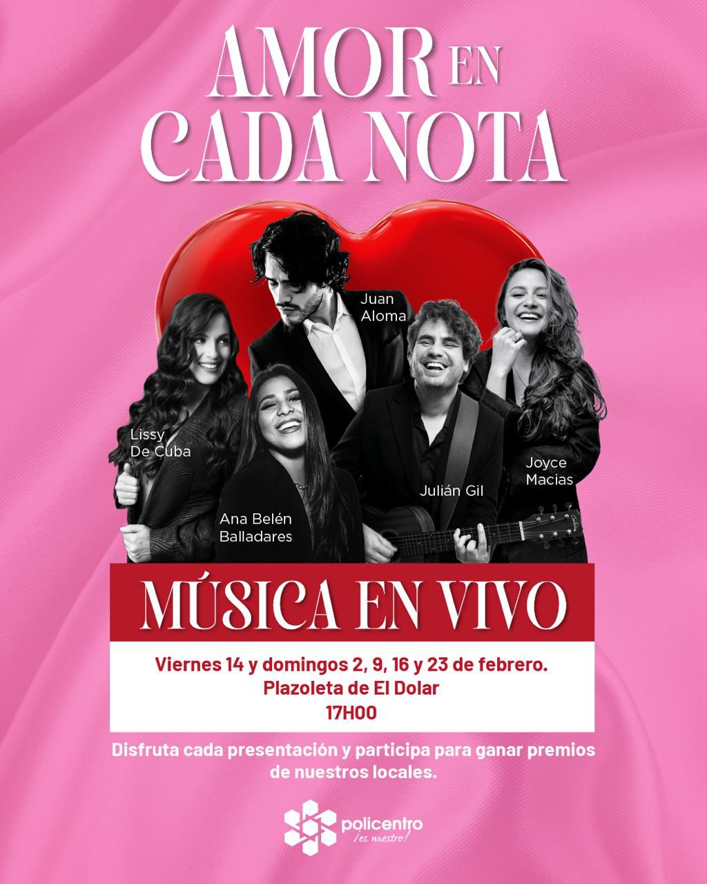 Los artistas son: Domingo 2 (Julian Gil) – Domingo 9 (Lissy de Cuba) – Viernes 14 (Joyce Macias) – Domingo 16 (Juan Aloma) – Domingo 23 (Ana Belén Balladares)
