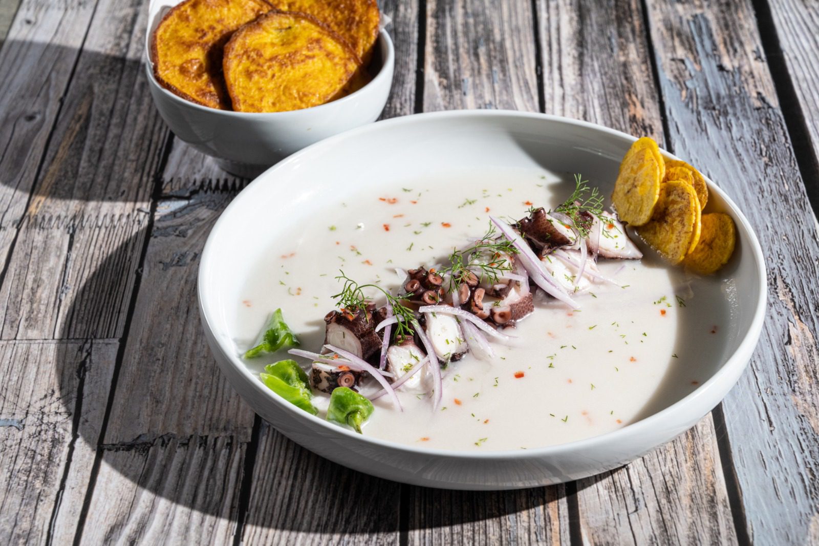 Cebiche De Pulpo: Pulpo, cebolla roja y ají limo, bañado en una leche de tigre; acompañado con tortitas de choclo.
