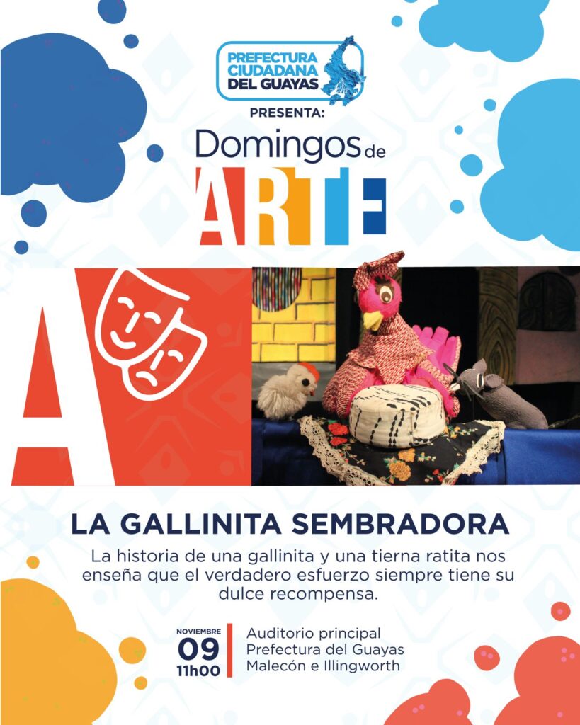 La Prefectura del Guayas, a través de la Dirección de Arte y Cultura, invita a la ciudadanía a disfrutar de una edición de “Domingos de Arte” con una encantadora puesta en escena “La Gallinita Sembradora”, una obra de teatro que promueve la expresión artística y el talento local de nuestra provincia.