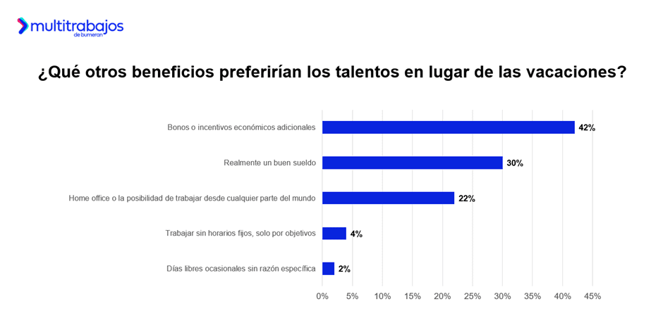 El 42% dice que optaría por bonos o incentivos económicos adicionales; el 30% prefiere un buen sueldo; y el 22% elegiría beneficios como el home office