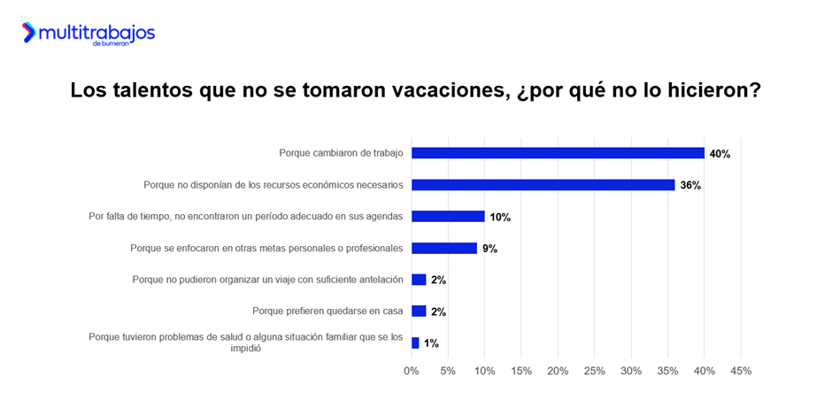 Entre quienes no se tomaron vacaciones, el 40% señala como principal razón el cambio de trabajo; el 36% menciona la falta de recursos económicos; el 10% lo atribuye a la falta de tiempo; y el 9% a que se enfocaron en otras metas personales o profesionales.