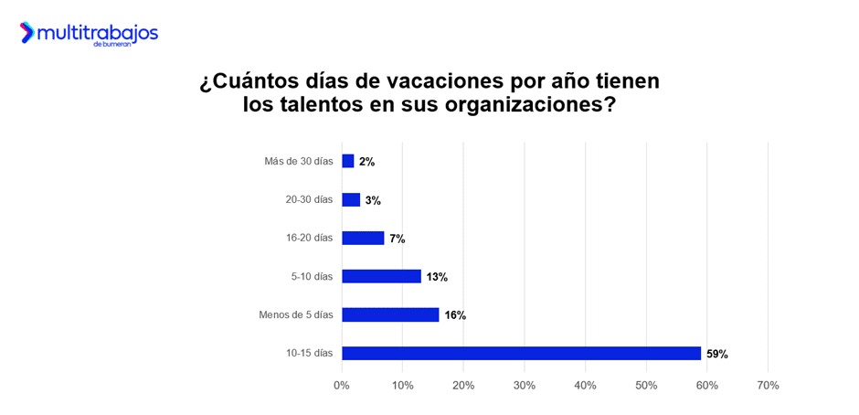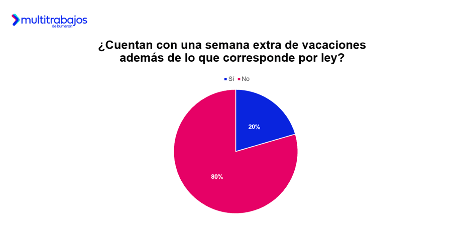 En ciertas organizaciones se observa la tendencia de ofrecer una semana adicional de vacaciones, además de lo establecido por ley. Sin embargo, solo el 20% de las personas trabajadoras afirma contar con este beneficio en sus empleos. Una situación similar se observa en la región: en Argentina, el 24% lo menciona; en Chile, el 18%; en Perú, el 16%; y en Panamá, el 14%.