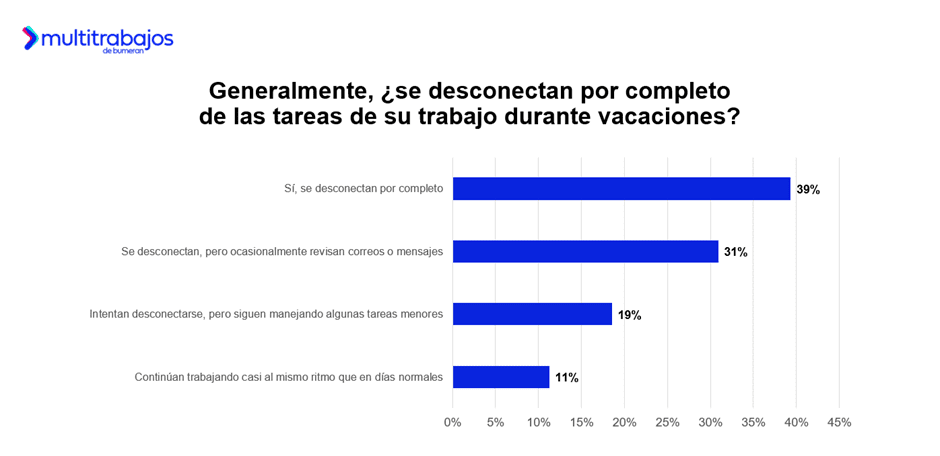 El 61% de los talentos asegura que les resulta difícil desconectarse de las tareas laborales durante sus vacaciones, mientras que el 39% afirma que sí logra hacerlo. Entre quienes no pueden desconectarse del trabajo, el 31% dice que revisa ocasionalmente mensajes o correos de trabajo; el 19% sigue gestionando algunas tareas menores; y el 11% continúa trabajando casi al mismo ritmo que en los días laborales.