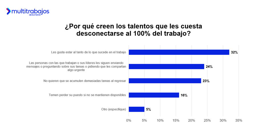 ¿Por qué les cuesta desconectarse al 100% del trabajo? El 32% menciona que le gusta estar informado sobre lo que ocurre en el trabajo; el 24% indica que sus compañeros y/o líderes continúan enviándoles mensajes o pidiendo que les compartan algo urgente; el 23% lo hace porque temen que se acumulen demasiadas tareas al regresar; y el 16% teme perder su puesto si no se encuentra disponible.