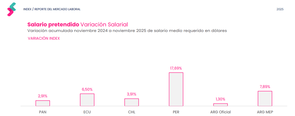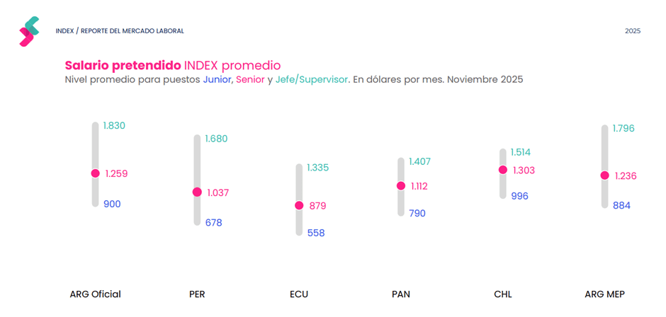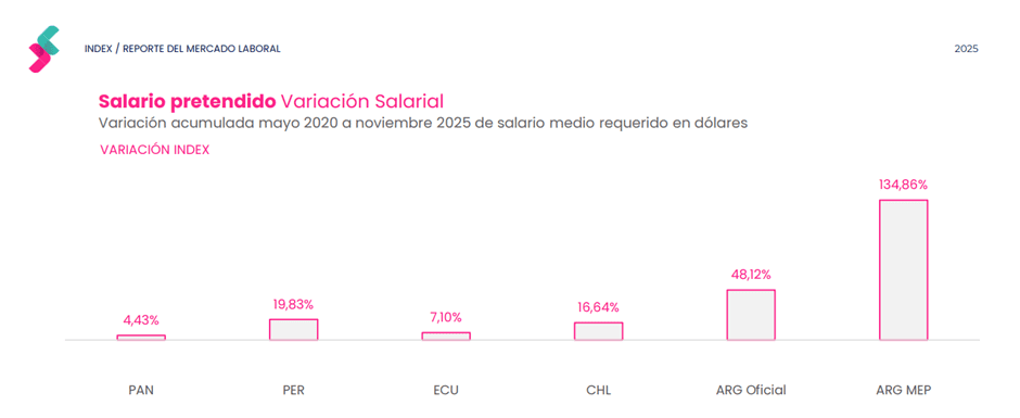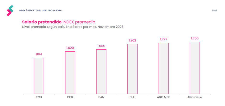 Argentina lidera la pretensión salarial promedio, con USD 1.250 calculado a dólar oficial y USD 1.227 calculado a dólar del Mercado Electrónico de Pagos (dólar MEP); le siguen Chile, con USD 1.202; Panamá, con USD 1.069; y Perú, con USD 1.020.