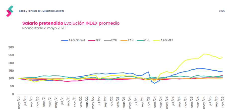 Sin embargo, al analizar la evolución de los salarios desde mayo de 2020 hasta noviembre de 2025, se observa que Ecuador, Panamá y Perú destacan como los países con mayor estabilidad salarial de la región. Chile registra un crecimiento moderado, mientras que, en el tramo final, Argentina presenta una recuperación significativa de los salarios medidos tanto en dólar MEP como en dólar oficial.