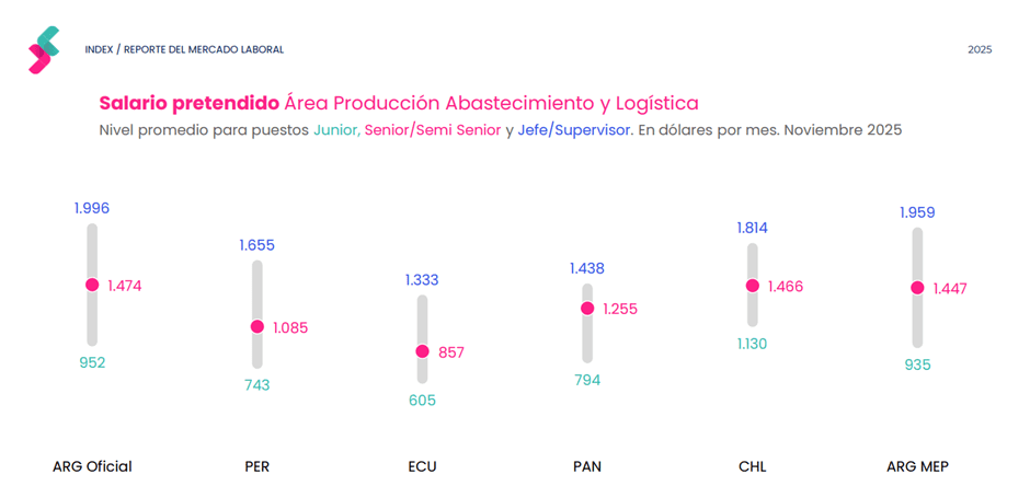 En Producción, Abastecimiento y Logística, en torno al salario promedio pretendido para los puestos junior, destaca Chile con USD 1.130; Argentina con USD 952 (en dólar oficial) y USD 935 (en dólar MEP); Panamá con USD 794; Perú con USD 743; y Ecuador con USD 605.