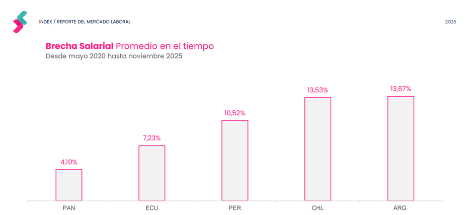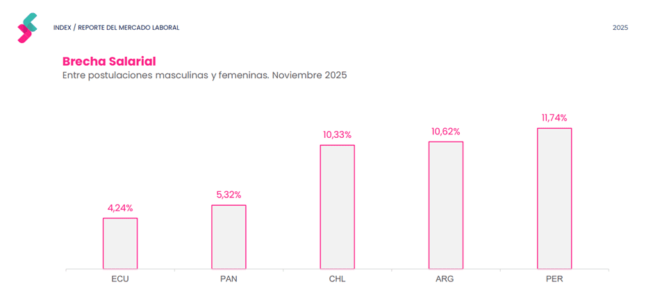 En noviembre de 2025, la brecha del salario requerido según género en Ecuador muestra una diferencia del 4,24% en los salarios pretendidos entre hombres y mujeres postulantes. Comparado con otros países de la región, Ecuador presenta una brecha salarial menor que Panamá, con 5,32%, Chile con 10,33%, Argentina con 10,62%, y Perú con 11,74%, siendo este último el país con la mayor brecha salarial de la región.